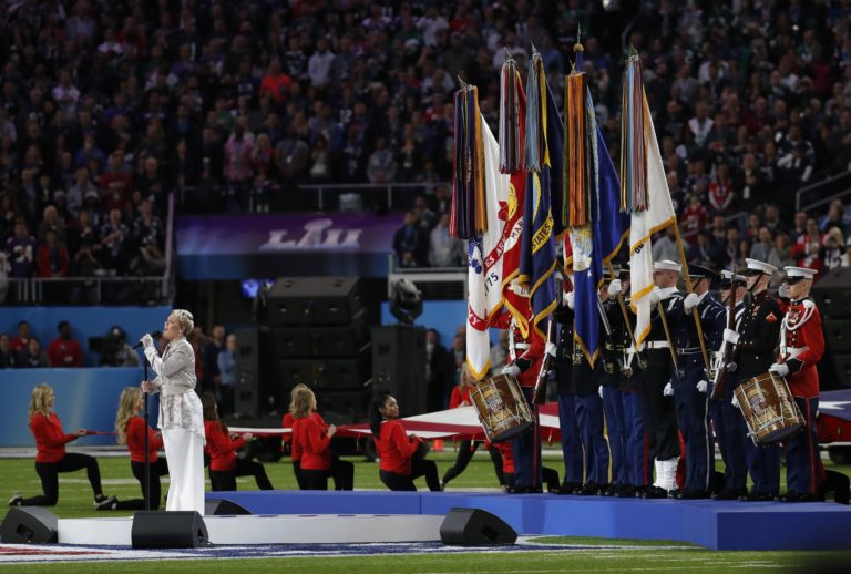 Speváčka Pink spieva americkú hymnu pred zápasom o Super Bowl LII medzi tímami Philadelphia Eagles a New England Patriots. Minneapolis, 4. február 2018. Minneapolis, 4. február 2018.