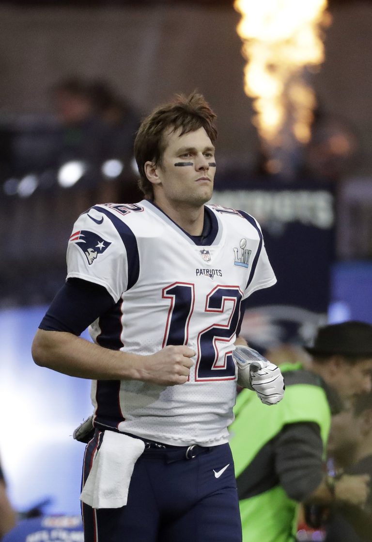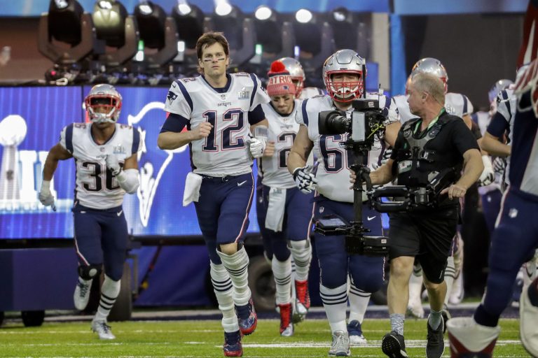 Hviezdny Tom Brady (12) nastupuje so spoluhráčmi na zápas o Super Bowl LII proti tímu Philadelphia Eagles. Minneapolis, 4. február 2018. Foto: SITA/AP.