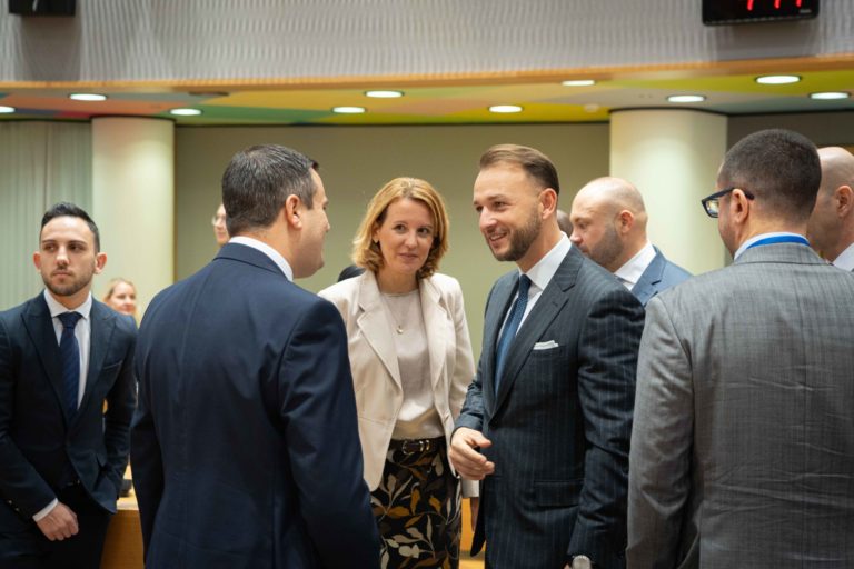 Minister vnútra SR Matúš Šutaj Eštok (v popredí vpravo) počas rokovania Rady ministrov vnútra JHA v Bruseli. Bratislava, 5. december 2023. Foto: SITA/MV SR