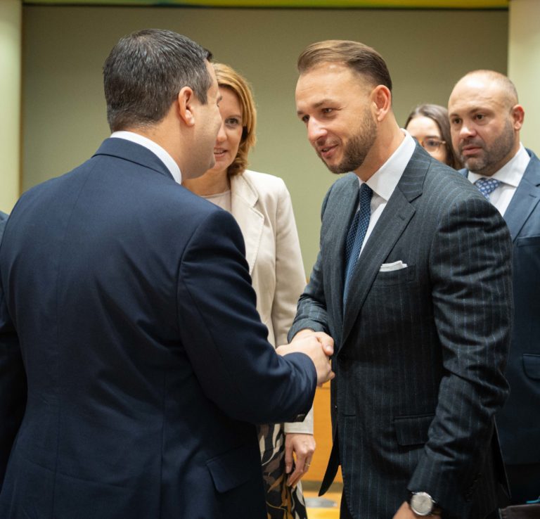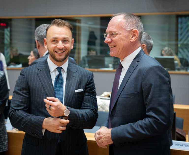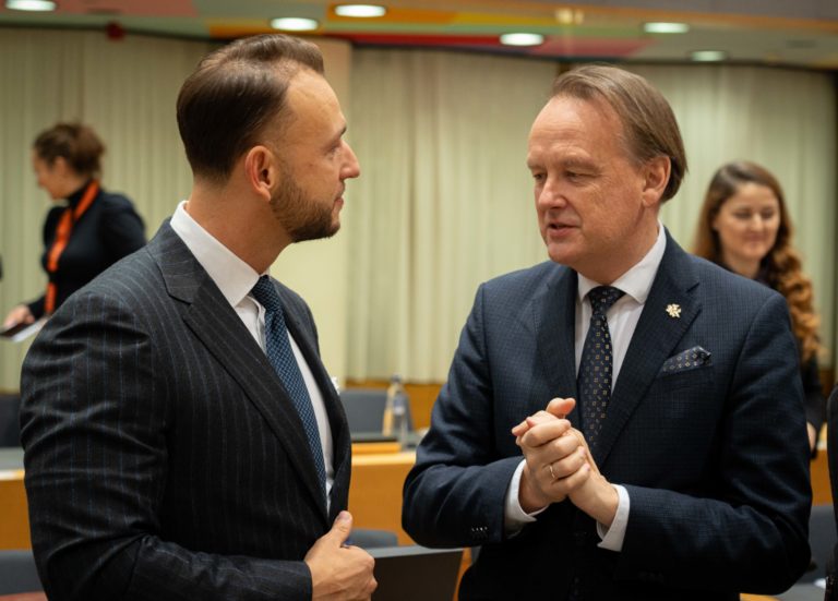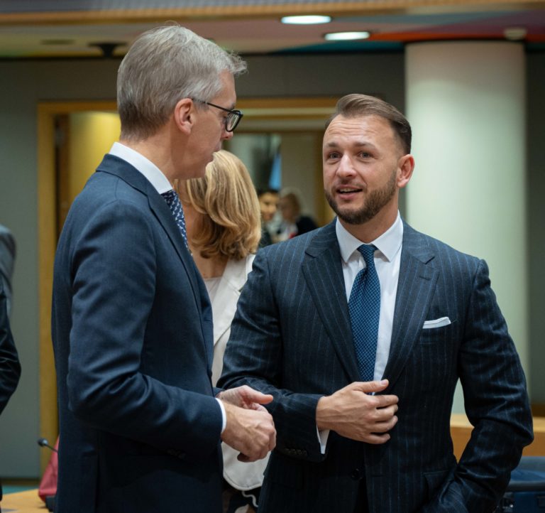Minister vnútra SR Matúš Šutaj Eštok (vľavo) počas rokovania Rady ministrov vnútra JHA v Bruseli. Bratislava, 5. december 2023. Foto: SITA/MV SR