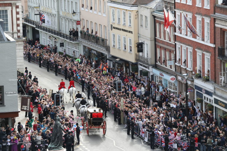 Mladomanželia po obrade vyrazili na jazdu v koči po Windsore.(12.10.2018, Andrew Matthews, Pool via AP)