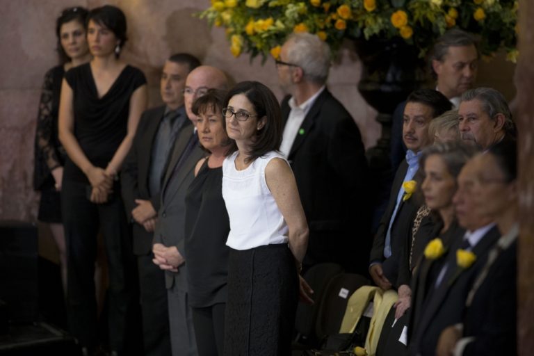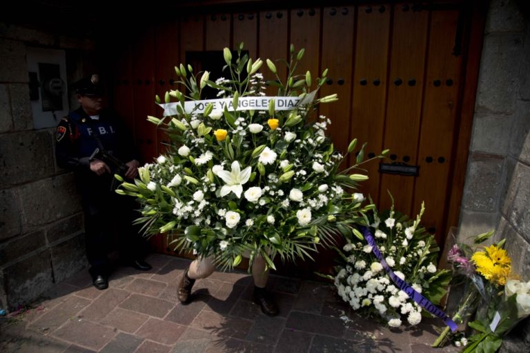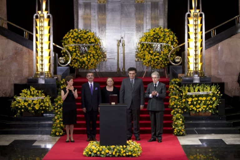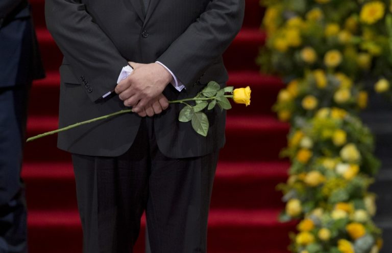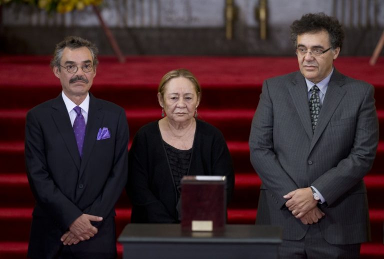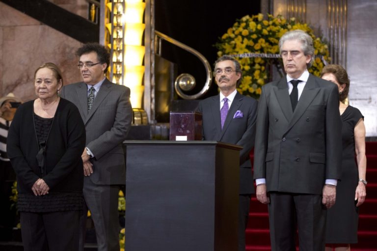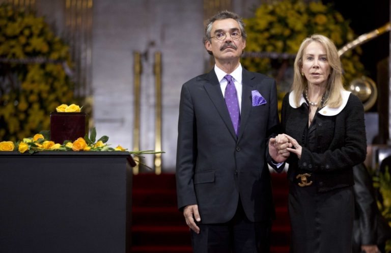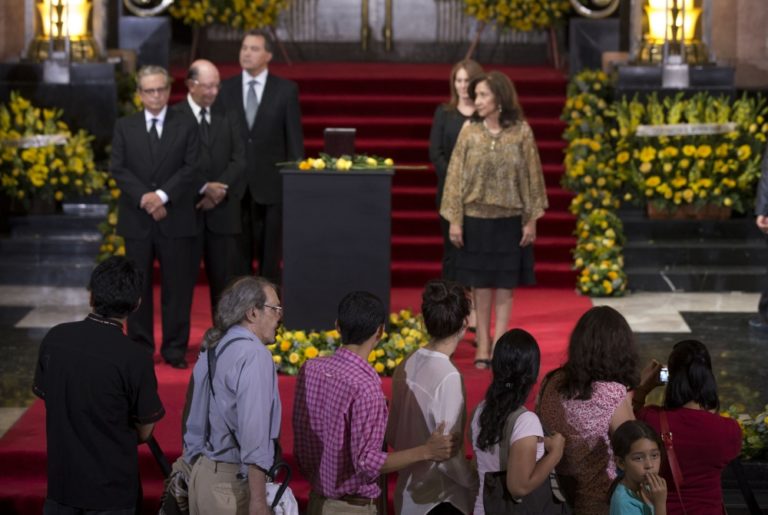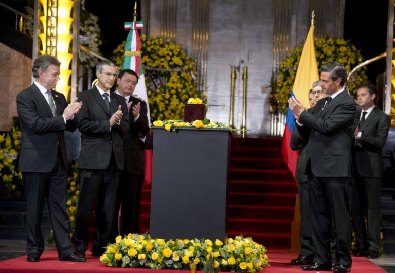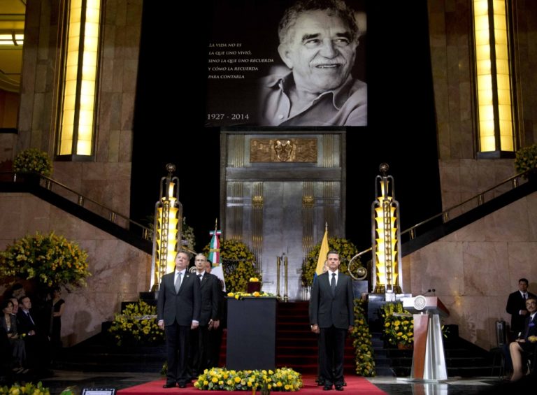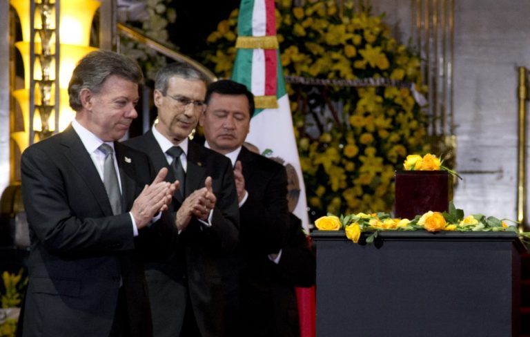 S autorom úspešných románov sa prišiel rozlúčiť aj prezident Mexika Enrique Pena Nieto, sprava, a Kolumbijský prezident Juan Manuel Santos, zľava. Foto: SITA/AP