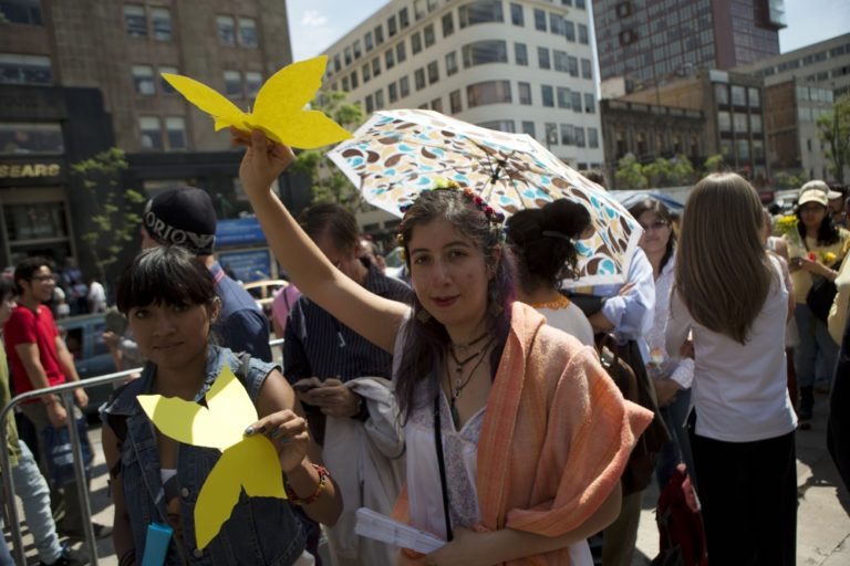 Žena opúšťajúca zádušnú omšu za Gabriela Garcíu Márqueza v záplave žltých motýľov pred Palace of Fine Arts v Mexiku. Foto: SITA/AP