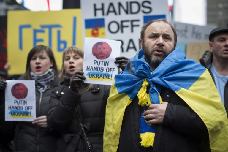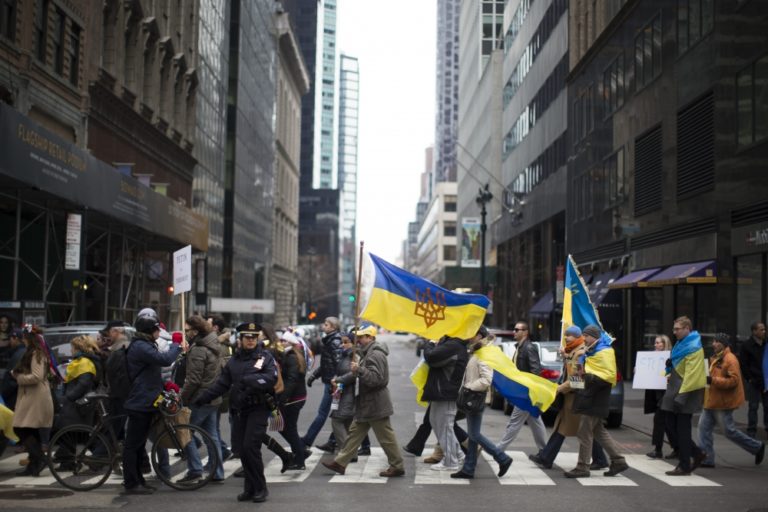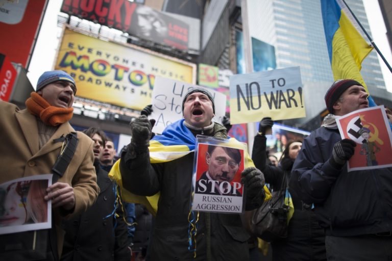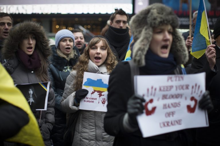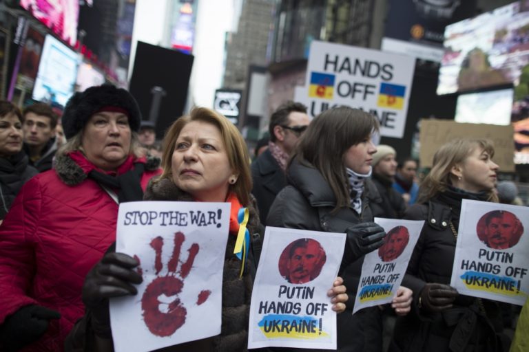 Invázia vojsk Ruska na ukrajinský Krym znepokojila celý svet. V New Yorku sa protestovalo. Foto: SITA/AP