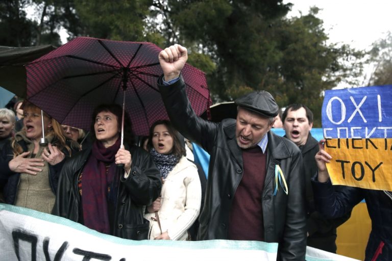 Invázia vojsk Ruska na ukrajinský Krym znepokojila celý svet. Protestovalo sa aj v hlavnom meste Grécka. Foto: SITA/AP