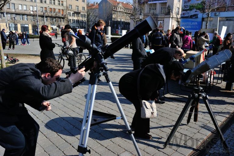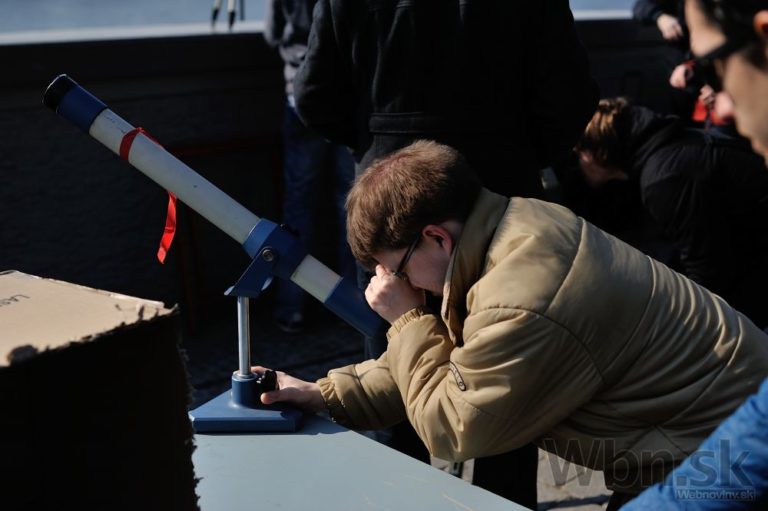 Pred Prírodovedeckým múzeom SNM v Bratislave si mohli ľudia pozrieť zatmenie Slnka cez profesionálne ďalekohľady. (20. marca 2015) Foto: SITA/Robert Tappert