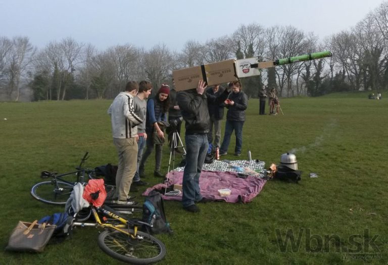 Skupinka ľudí si na pozorovanie čiastočného zatmenia Slnka pri Cliftonskom observatóriu v anglickom Bristole priniesla podomácky vyrobené zariadenie (20. marca 2015) Foto: SITA/AP