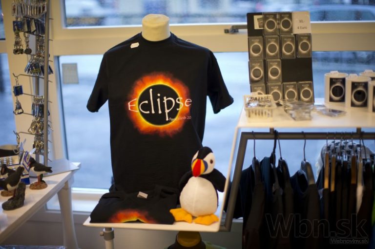 Na Faerských ostrovoch mohli ľudia pozorovať úplné zatmenie Slnka. Na ojedinelý prírodný úkaz sa pripravili aj výrobcovia suvenírov. (20. marca 2015) Foto: SITA/AP