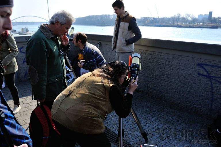 Pohľad na čiastočné zatmenia slnka počas astronomického pozorovania pred Prírodovedným múzeom SNM v Bratislave, na Vajanského nábreží. (20. marca 2015) Foto: SITA/Robert Tappert