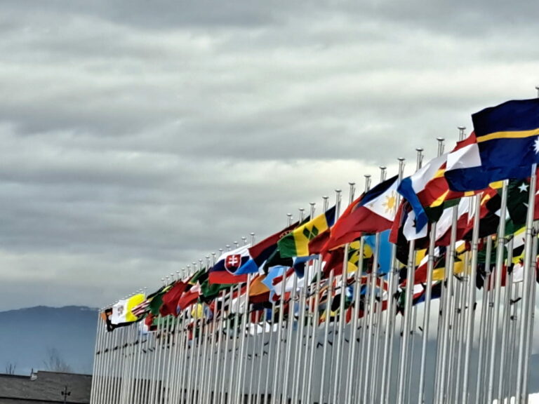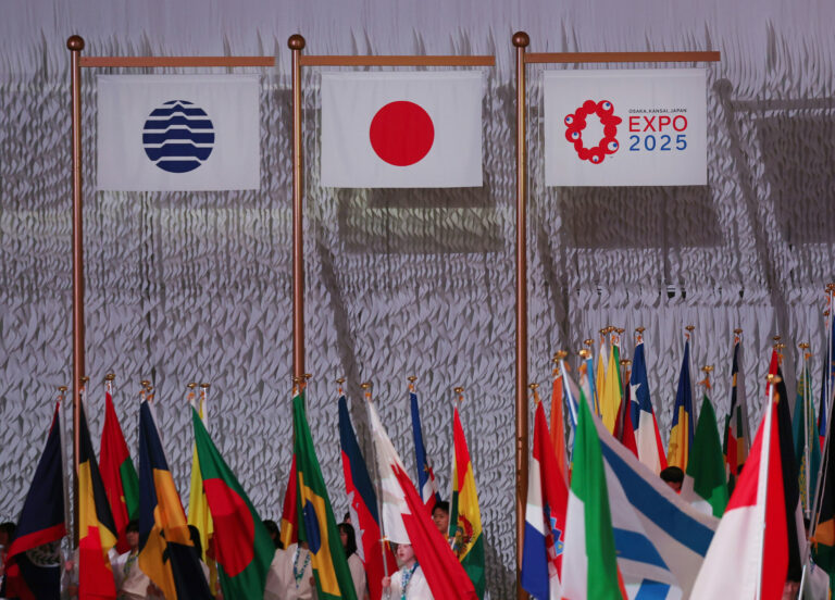 Zľava sú vidieť vlajky Medzinárodného úradu pre výstavy, Japonska a Osaka Expo 2025. Foto: Jia Haocheng/Pool Photo via AP