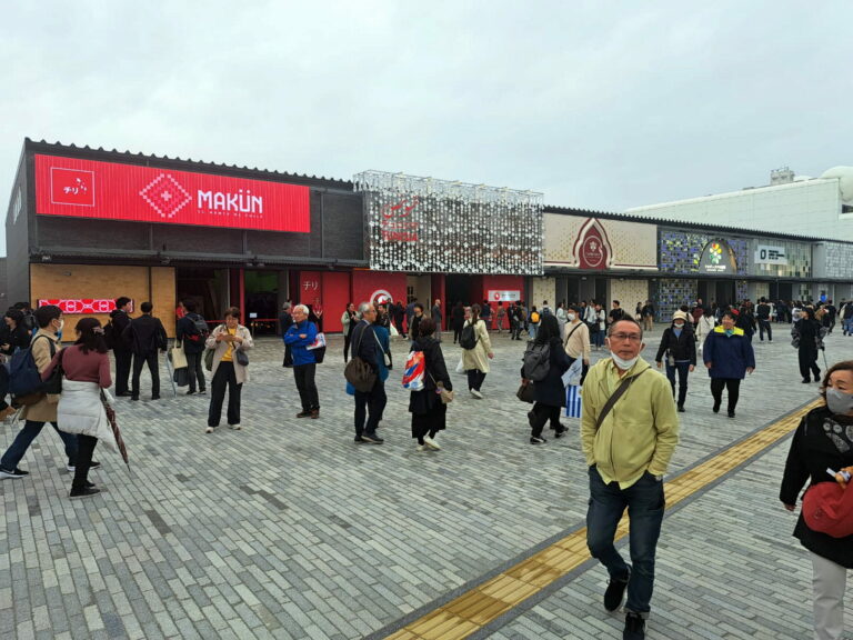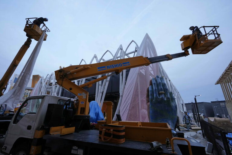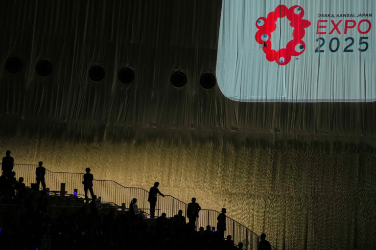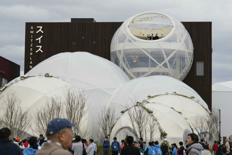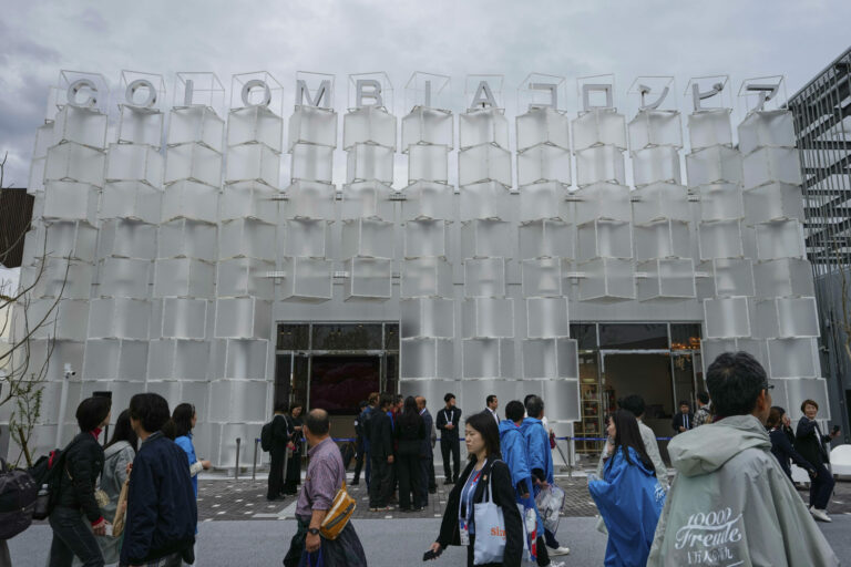 Visitors walk past the pavilion of Colombia on the opening day of the Expo 2025 in Osaka, central Japan, Sunday, April 13, 2025. (AP Photo/Hiro Komae)