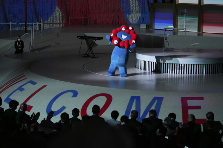 Maskot Osaka Expo Myaku-Myaku, červeno-modré stvorenie, ktoré symbolizuje bunku a vodu na konci otváracieho ceremoniálu Expo v Osake v strednom Japonsku, v sobotu 12. apríla 2025. Foto: SITA/AP