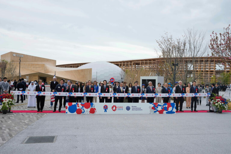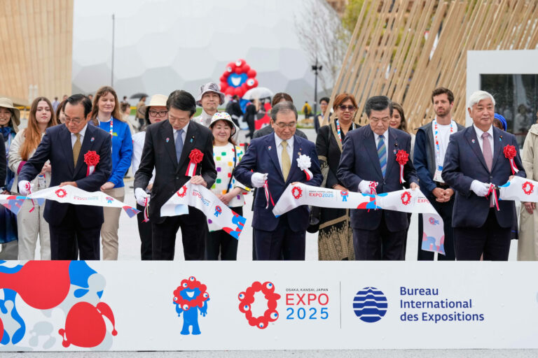 Predstavitelia prestrihli pásku počas slávnostného prestrihnutia pásky pred otvorením výstavy Osaka Expo 2025 v Osake v západnom Japonsku v nedeľu 13. apríla 2025. Foto: SITA/AP