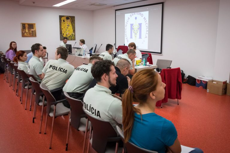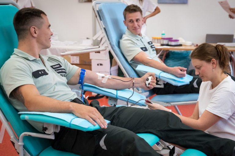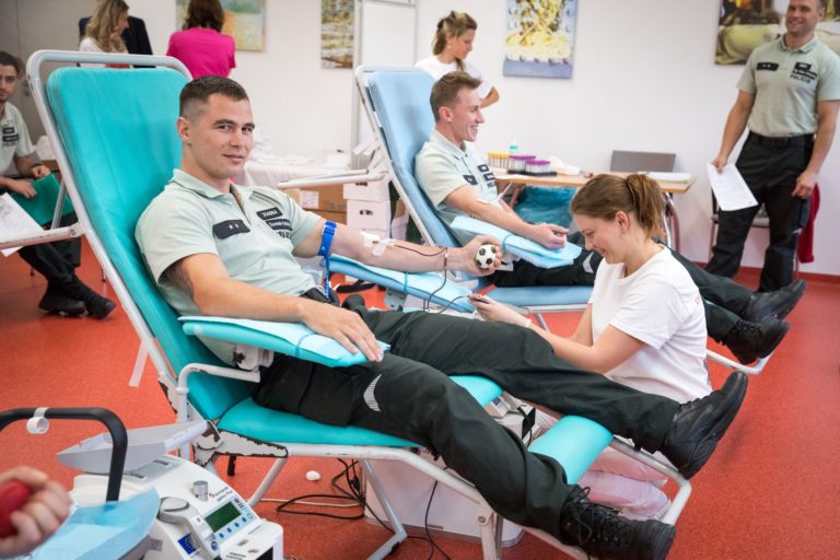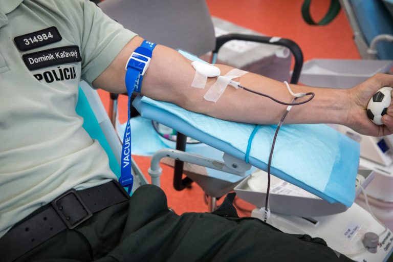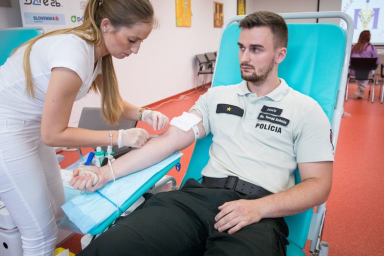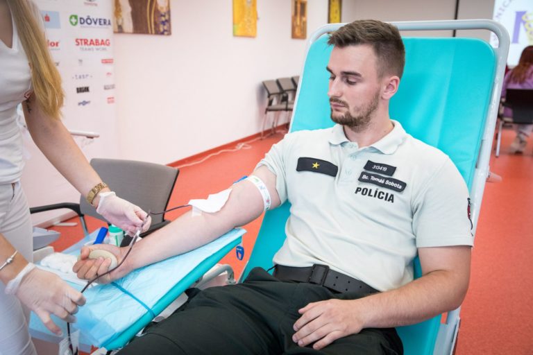 Príslušníci Policajného zboru (PZ) počas darovania krvi pri príležitosti Svetového dňa darcov krvi 2018 pod záštitou Ministerstva vnútra SR v Nemocnici sv. Michala. Bratislava, 14. jún 2018. Foto: SITA/Diana Černáková