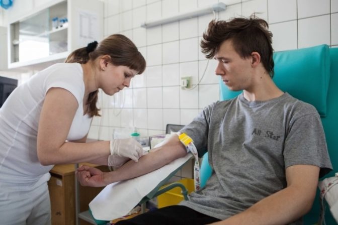 Dobrovoľník daruje krv na akcii, ktorú zorganizovala Národná transfúzna služba SR pre všetkých darcov krvi, a aj tých, ktorí ešte darcami krvi nie sú pri príležitosti Svetového dňa darcov krvi. Bratislava, 12. jún 2011. Foto: SITA/Jozef Jakubčo