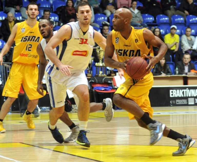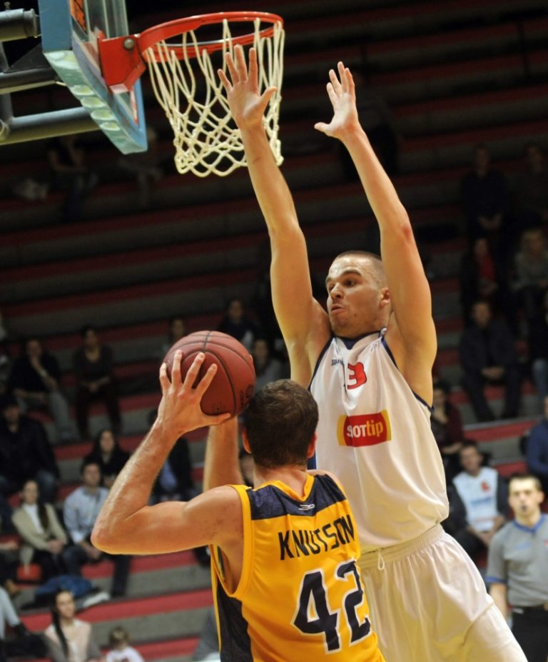 Sprava: Wes Channels zo Svitu a Pavol Lošonský z Nitry vo finále Slovenského pohára v basketbale mužov medzi Iskra Svit - Edymax SPU Nitra. Foto: SITA/Ján Slovák