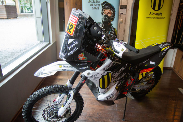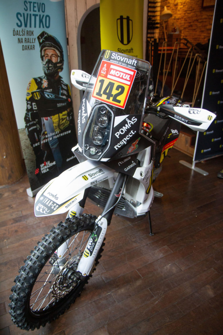 Motocykel slovenského motocyklového pretekára Štefana Svitka počas tlačovej konferencie Slovnaft Rally Teamu o prípravách na 46. ročník Rely Dakar 2024 v Saudskej Arábii. Bratislava 27. november 2023. Foto: SITA/Ľudovít Vaniher
