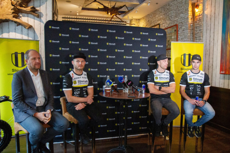 Zľava: Slovenský motocyklový jazdec Štefan Svitko, člen Slovnaft Rally Teamu Ladislav Murinec a člen Slovnaft Rally Teamu Rastislav Kokavec počas tlačovej konferencie Slovnaft Rally Teamu o prípravách na 46. ročník Rely Dakar 2024 v Saudskej Arábii. Bratislava 27. november 2023. Foto: SITA/Ľudovít Vaniher