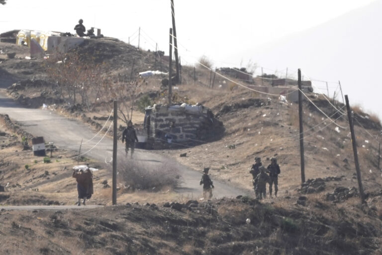 A Syrian man waves a white flag, as he approaches Israeli soldiers to negotiate with them, where they set their new position at an abandoned Syrian military base, in Maariyah village near the border with Israel in southern Syria, Thursday, Dec. 19, 2024. (AP Photo/Hussein Malla)