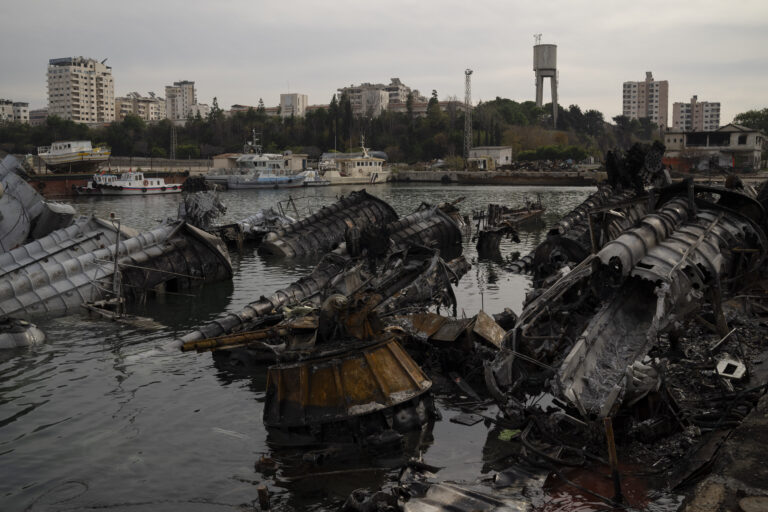 Destroyed Syrian naval vessels from previous Israeli airstrikes are seen in the port of Latakia, Syria, Monday, Dec. 16, 2024. (AP Photo/Leo Correa)
