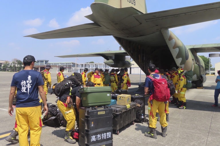 Na tejto fotografii, ktorú zverejnilo velenie taiwanských vzdušných síl, sa členovia pátracieho a záchranného tímu chystajú nastúpiť do lietadla, aby pomohli po ničivom zemetrasení, ktoré zasiahlo Taiwan. Foto: Taiwan Air Force Command via AP.
