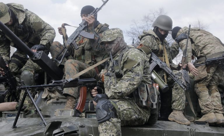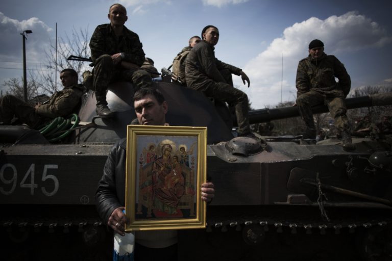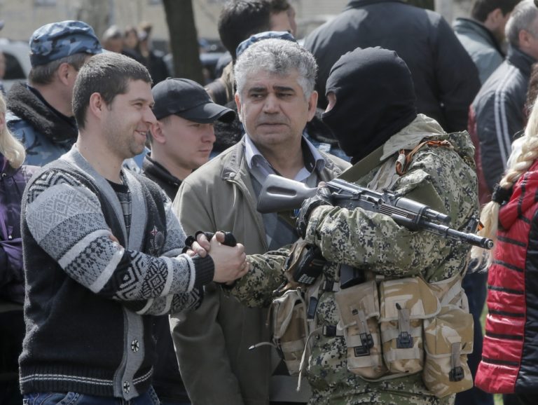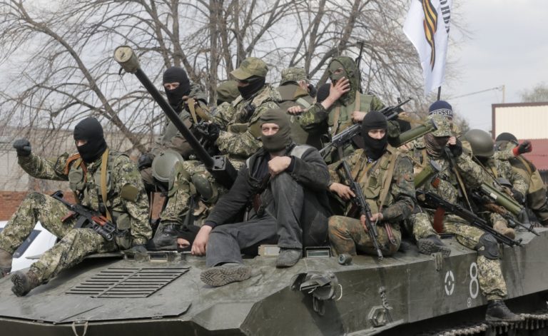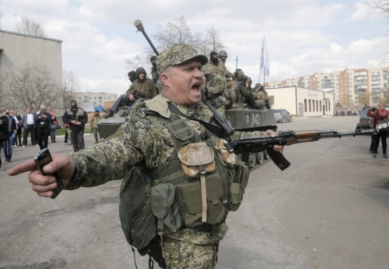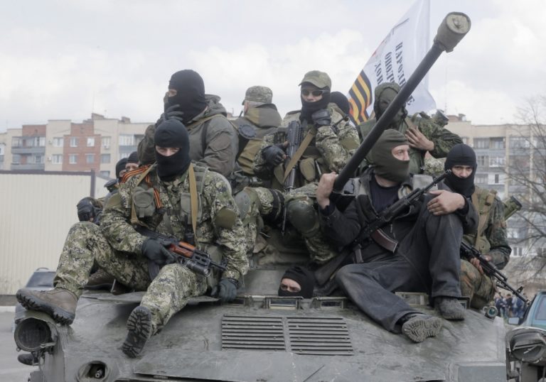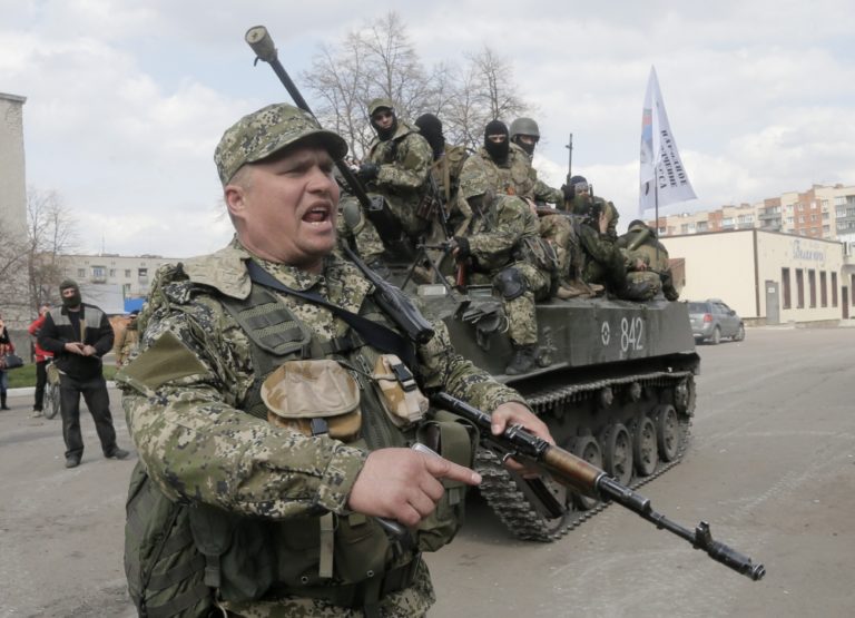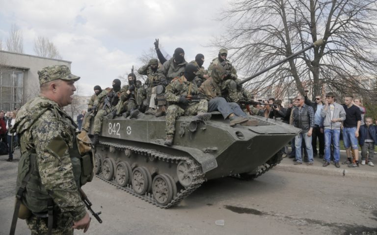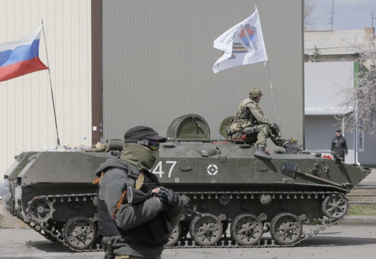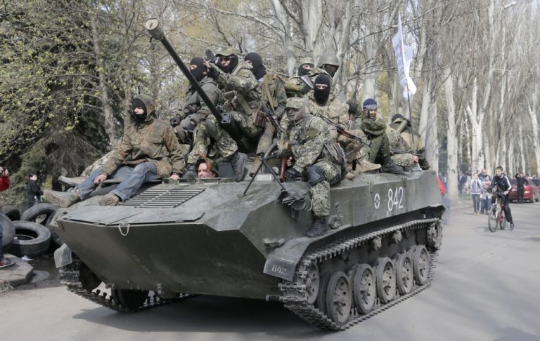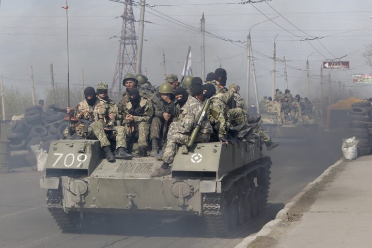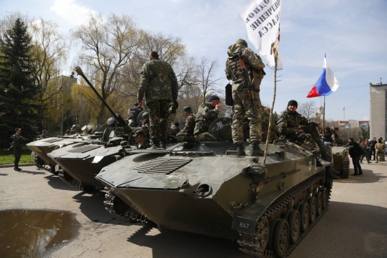 Po meste Kramatorsk na východe Ukrajiny sa v obrnených armádnych vozidlách s ruskou vlajkou premávajú neidentifikovaní vojaci. Foto: SITA/ AP