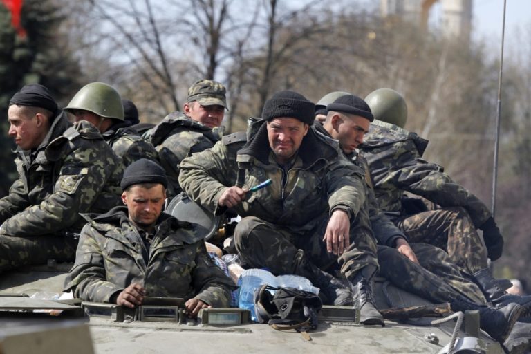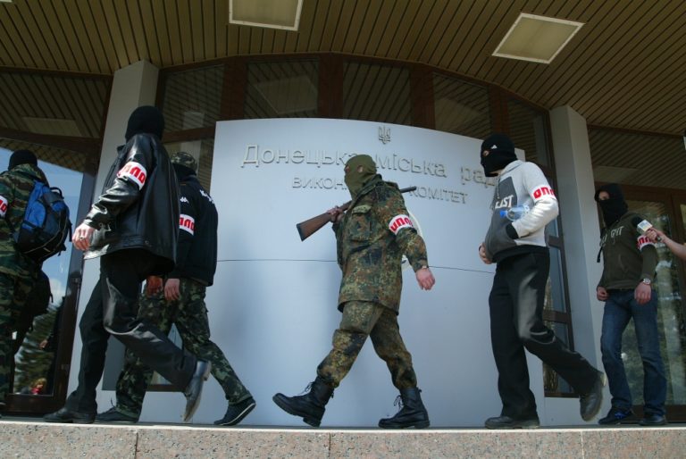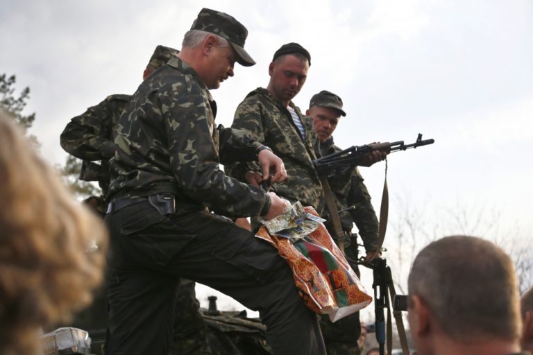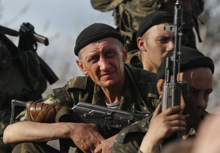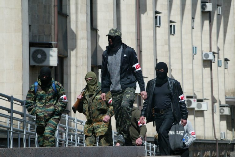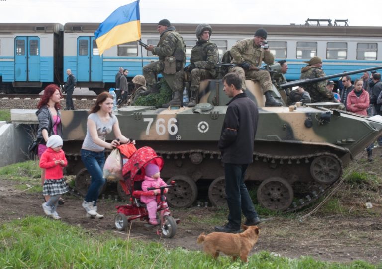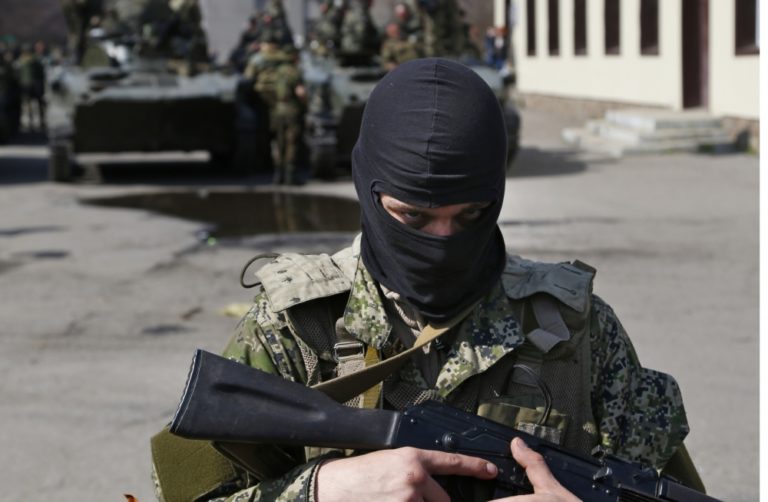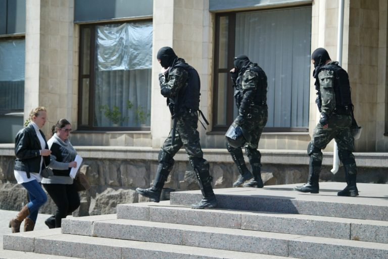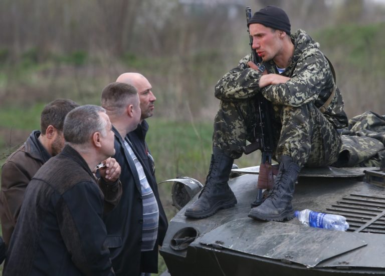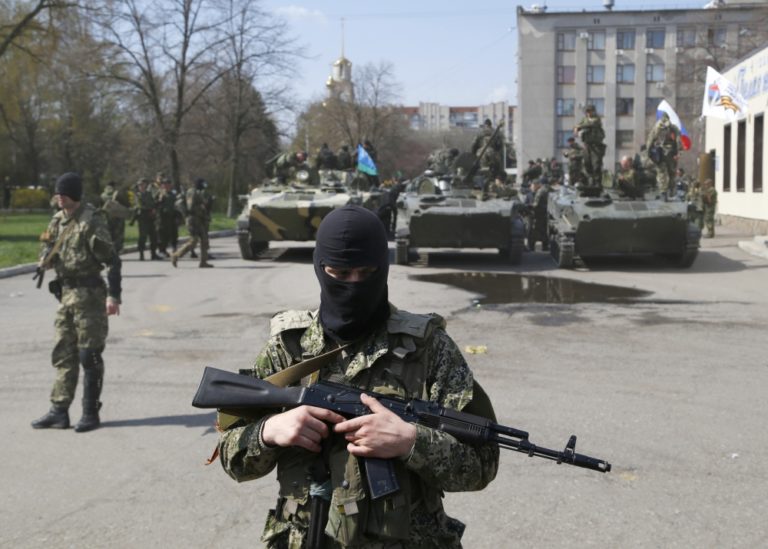 Po meste Kramatorsk na východe Ukrajiny sa v obrnených armádnych vozidlách s ruskou vlajkou premávajú neidentifikovaní vojaci.