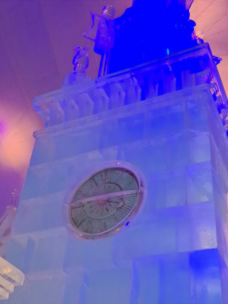 Detail jednoručičkových hodín na veži Wawelskej katedrály z ľadu - Tatranského ľadového dómu na Hrebienku, ktoré ukazujú čas úmrtia Jána Pavla II. v súvislosti s budúcoročným 30. výročím jeho návštevy vo Vysokých Tatrách. Vysoké Tatry, 14. november 2024. Foto: SITA/Mária Frisová.