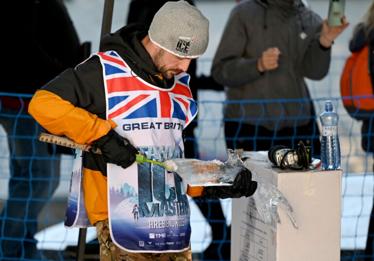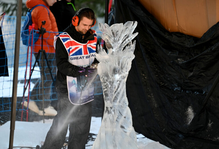 Člen tímu z Veľkej Británie pri vyrezávanie sochy z ľadu na Hrebienku vo Vysokých Tatrách počas 11. ročníka medzinárodných majstrovstiev ľadových sochárov Tatry Ice Master na tému: Anjeli medzi nami. Vysoké Tatry, 18. január 2025. Foto: SITA/Viktor Zamborský