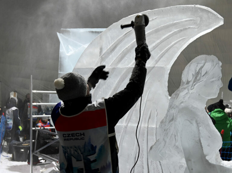 Člen tímu z Čiech pri vyrezávanie sochy z ľadu na Hrebienku vo Vysokých Tatrách počas 11. ročníka medzinárodných majstrovstiev ľadových sochárov Tatry Ice Master na tému: Anjeli medzi nami. Vysoké Tatry, 18. január 2025. Foto: SITA/Viktor Zamborský