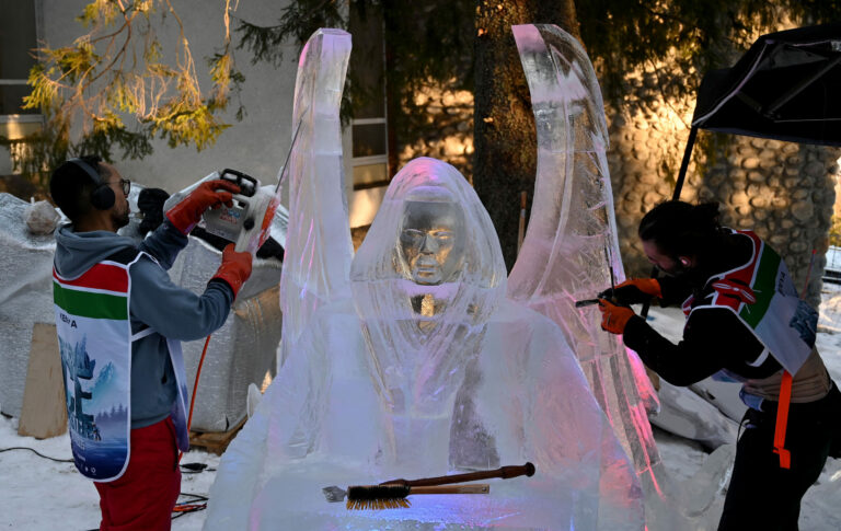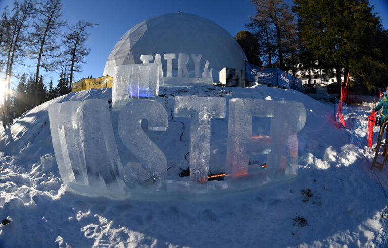 Pohľad na nápis na Hrebienku vo Vysokých Tatrách počas 11. ročníka medzinárodných majstrovstiev ľadových sochárov Tatry Ice Master na tému: Anjeli medzi nami. Vysoké Tatry, 18. január 2025. Foto: SITA/Viktor Zamborský