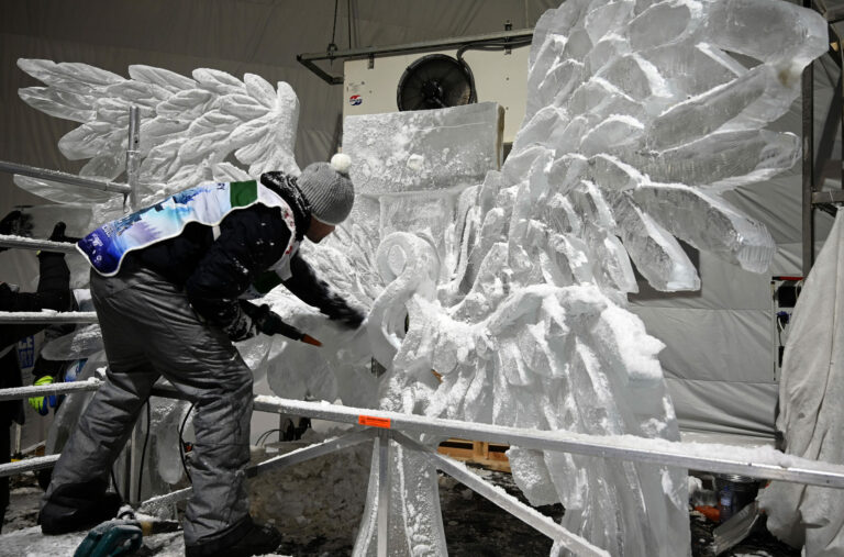 Člen maďarského tímu pri vyrezávaní sochy z ľadu s názvom: Buď anjelom na Hrebienku vo Vysokých Tatrách počas 11. ročníka medzinárodných majstrovstiev ľadových sochárov Tatry Ice Master na tému: Anjeli medzi nami. Vysoké Tatry, 18. január 2025. Foto: SITA/Viktor Zamborský