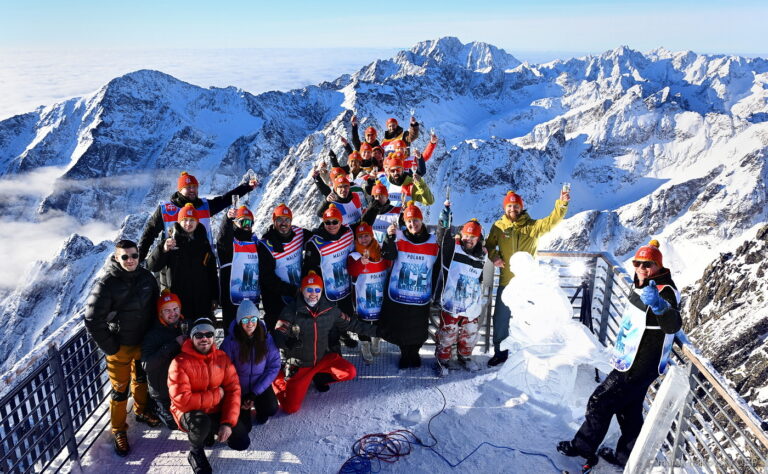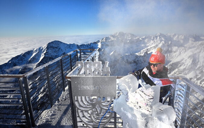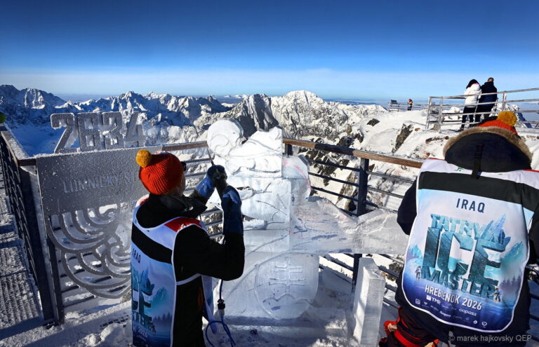 Účastníci z 10 krajín sveta sa fotia na Lomnickom štíte s prvou vyrezanou ľadovou sochou s názvom Petra Vlhová, ktorú vytvorili sochári z Iraku, ako súčasť 12. ročníka medzinárodných majstrovstiev ľadových sochárov Tatry Ice Master vo Vysokých Tatrách. Vysoké Tatry, 16. januára 2026. Foto: SITA/Facebook Vysoké Tatry – Hory zážitkov