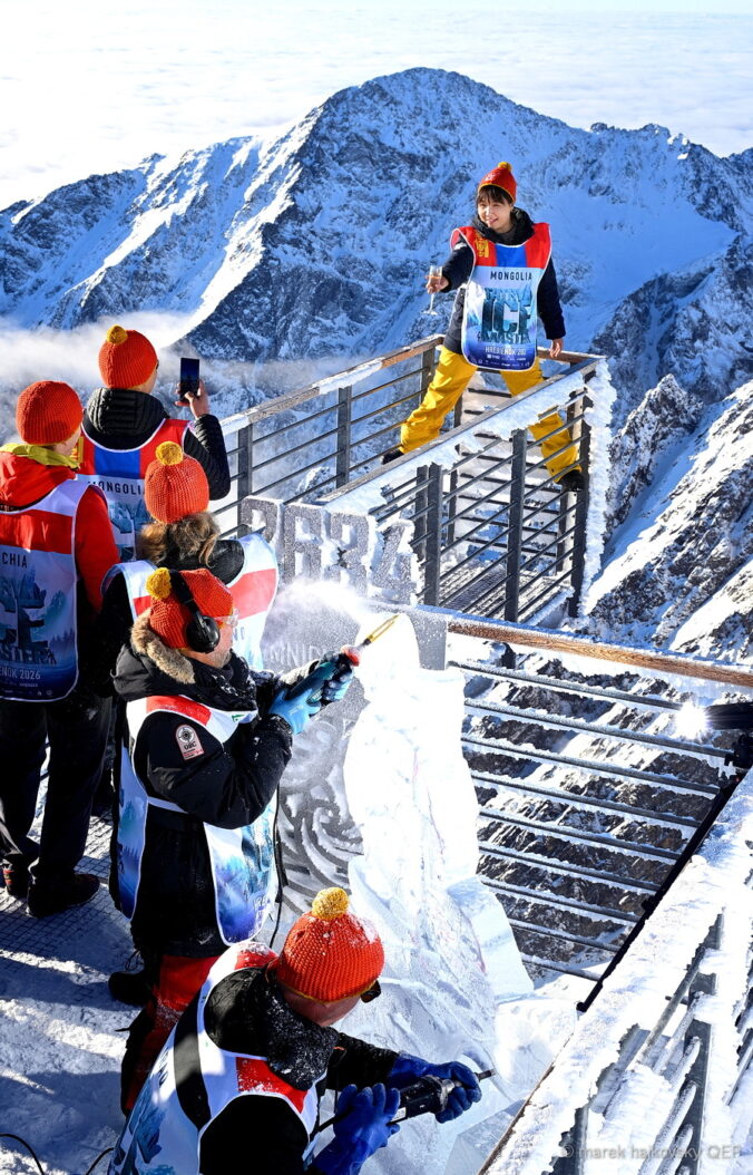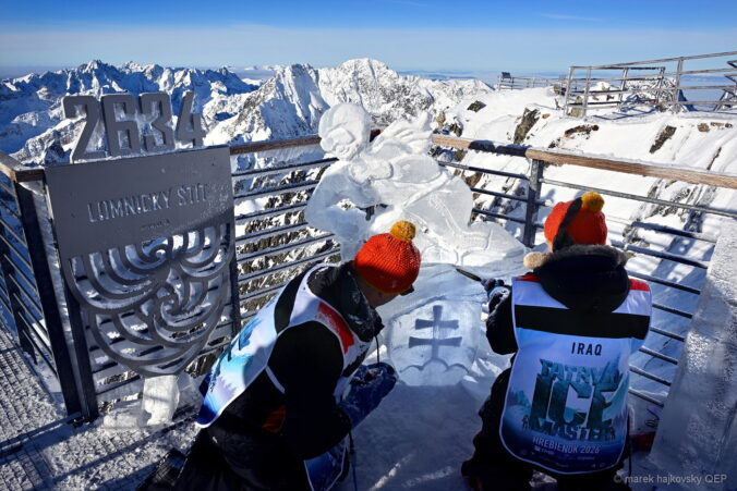 Sochári z Iraku vyrezávajú na Lomnickom štíte prvú ľadovú sochu s názvom Petra Vlhová pred začatím 12. ročníka medzinárodných majstrovstiev ľadových sochárov Tatry Ice Master vo Vysokých Tatrách. Vysoké Tatry, 16. január 2026. Foto: SITA/Facebook Vysoké Tatry – Hory zážitkov