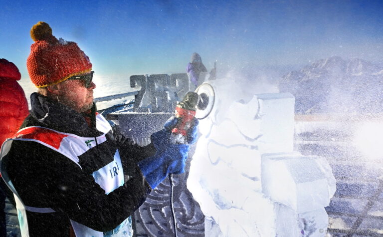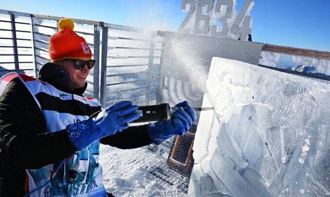 Sochár z Iraku vyrezáva na Lomnickom štíte prvú ľadovú sochu s názvom Petra Vlhová pred začatím 12. ročníka medzinárodných majstrovstiev ľadových sochárov Tatry Ice Master vo Vysokých Tatrách. Vysoké Tatry, 16. január 2026. Foto: SITA/Facebook Vysoké Tatry – Hory zážitkov