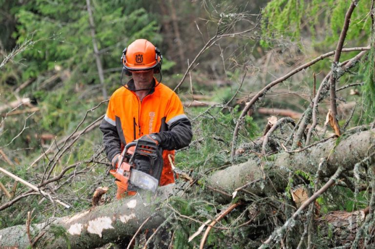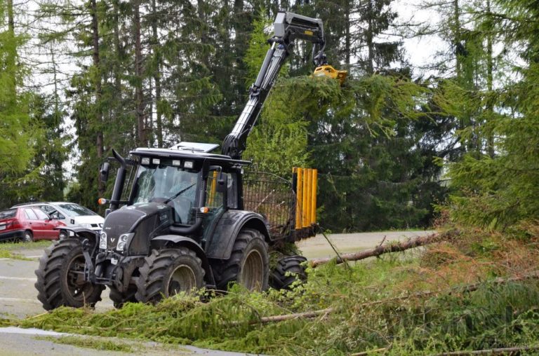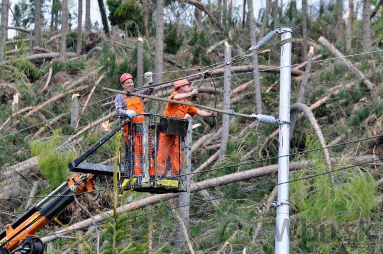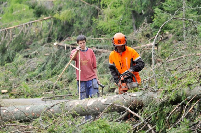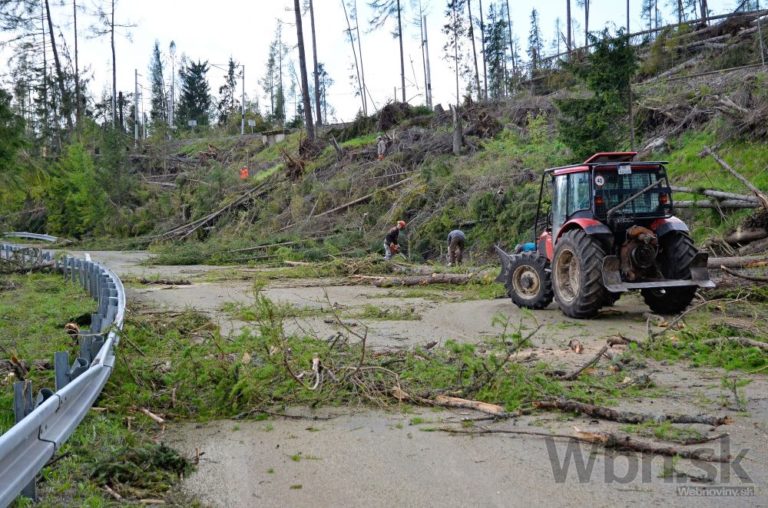Práce na odstránení následkov silného vetra na ceste medzi Vyšnými Hágmi a Štrbským Plesom. Vysoké Tatry, 20. máj 2014.