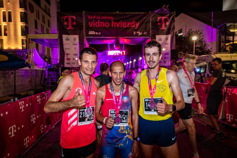 Zľava: Bežec Tibor Sahajda na prvom mieste, Marek Hladík na druhom mieste a Michal Staník na treťom mieste v kategórii Beh mužov do 39 rokov po vyhlásení výsledkov v rámci 14. ročníka bežeckého podujatia Telekom Night Run, ktorý sa uskutočnil 3. septembra v Bratislave. Foto: SITA/Be Cool