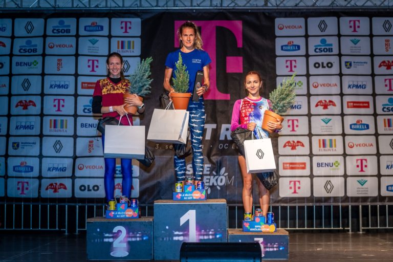 Zľava: Bežkyňa Lucia Pelikánová na druhom mieste, bežkyňa Žofia Naňová na prvom mieste a Zuzana Gejdošová na treťom mieste v kategórii Beh žien do 39 rokov po vyhlásení výsledkov v rámci 14. ročníka bežeckého podujatia Telekom Night Run, ktorý sa uskutočnil 3. septembra v Bratislave. Foto: SITA/Be Cool