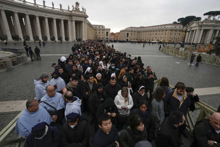 Návštevníci, ktorí prišli vzdať hold zosnulému pápežovi Benediktovi XVI., čakajú v radoch pred Bazilikou Svätého Petra vo Vatikáne. Foto: SITA/AP