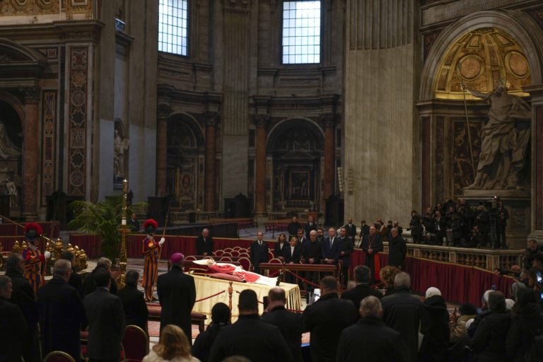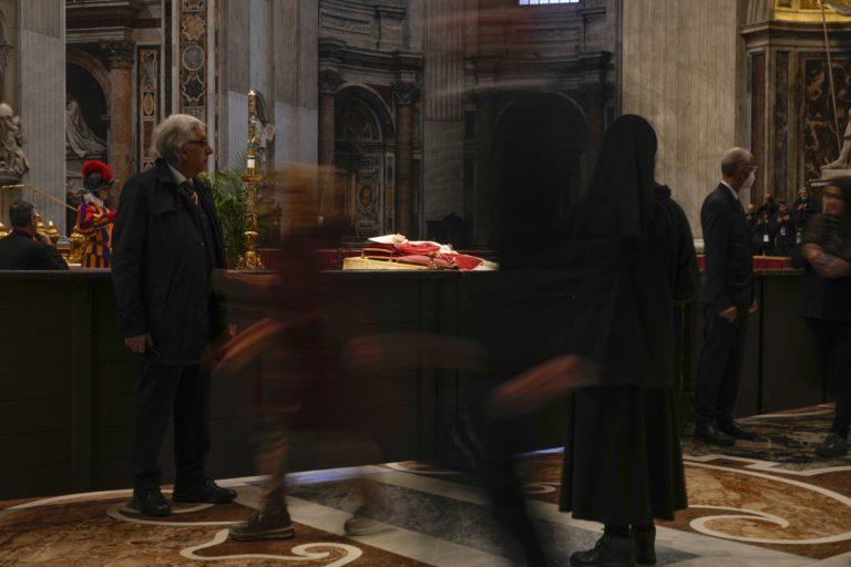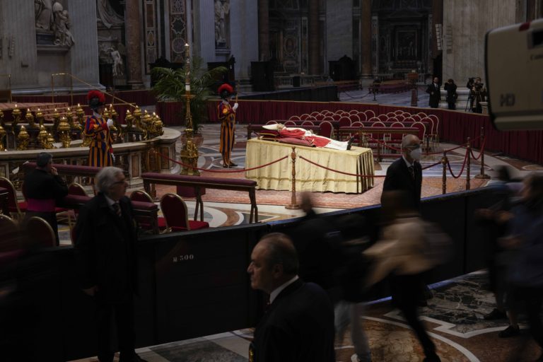 Na telo zosnulého pápeža Benedikta XVI., ktoré je vystavené v Bazilike Svätého Petra vo Vatikáne, sa môžu prísť pozrieť návštevníci a vzdať mu hold. Foto: SITA/AP