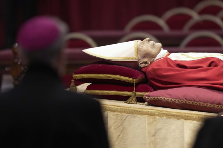 Telo zosnulého pápeža Benedikta XVI. je vystavené v Bazilike Svätého Petra vo Vatikáne. Foto: SITA/AP