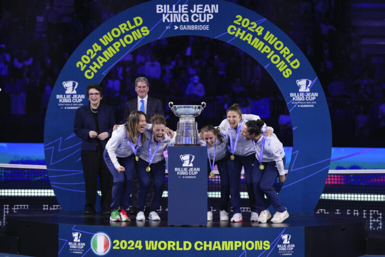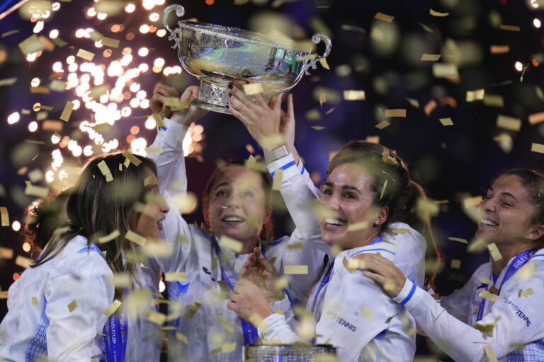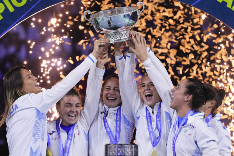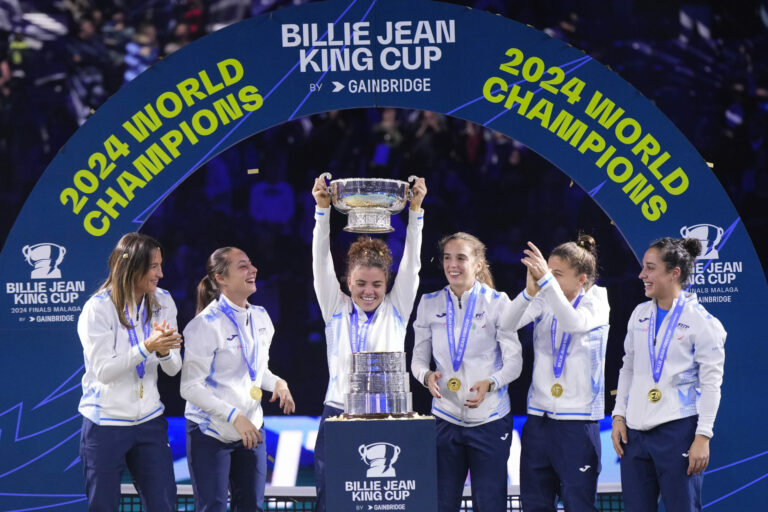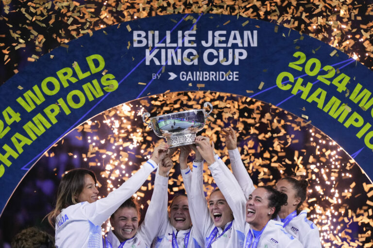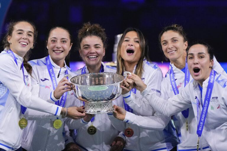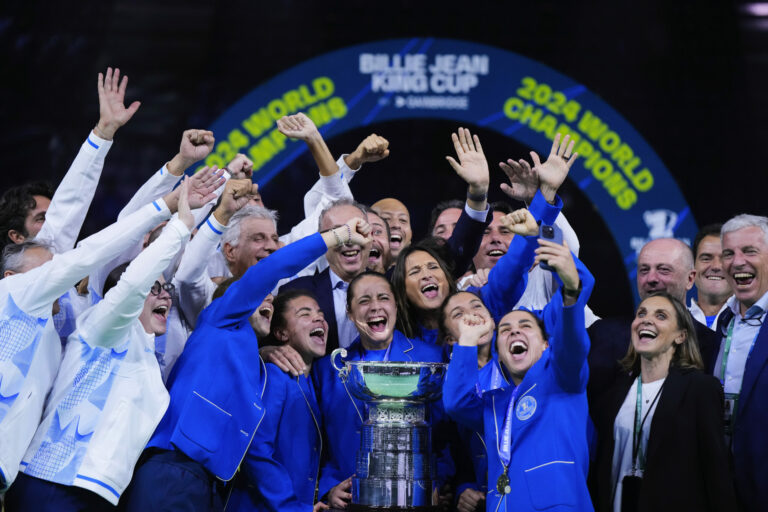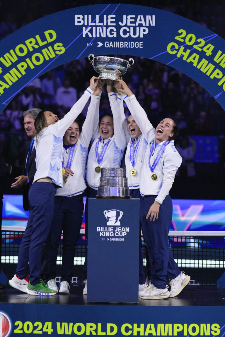 Radosť talianskych tenistiek po triumfe nad Slovenkami vo finále Pohára Billie Jean Kingovej. Málaga, 20. november 2024. Foto: SITA/AP