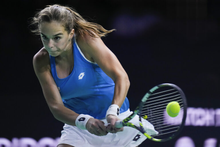 Slovenská tenistka Viktória Hrunčáková počas prvej dvojhry vo finále Pohára Billie Jean Kingovej, v ktorej podľahla Talianke Lucii Bronzettiovej 2:6, 4:6. Málaga, 20. november 2024. Foto: SITA/AP.