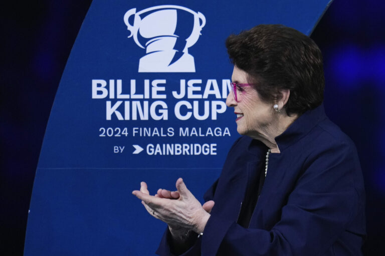 Tenisová legenda Billie Jean Kingová pred slávnostným ceremoniálom po finálovom zápase Slovensko - Taliansko. Málaga, 20. november 2024. Foto: SITA/AP.