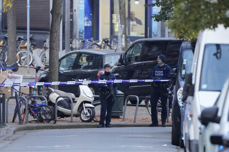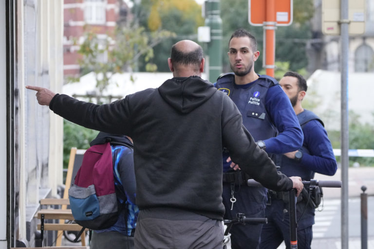 Belgická polícia sa rozpráva s miestnymi ľuďmi neďaleko miesta, kde došlo k zabitiu dvoch Švédov. Foto: SITA/AP