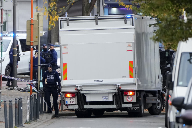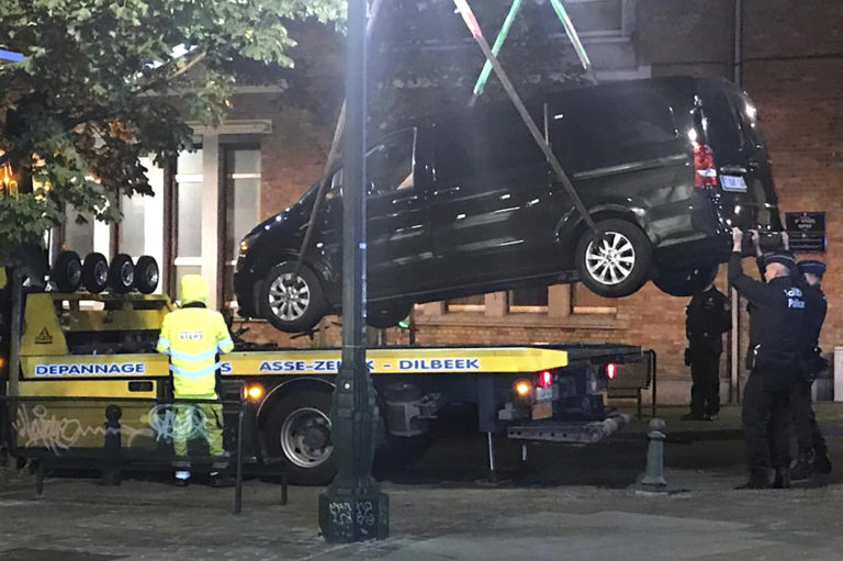 Policajná hliadka dala odtiahnuť dodávku z miesta streľby v centre Bruselu. Teroristický útok si v belgickej metropole vyžiadal životy dvoch Švédov. Foto: SITA/AP