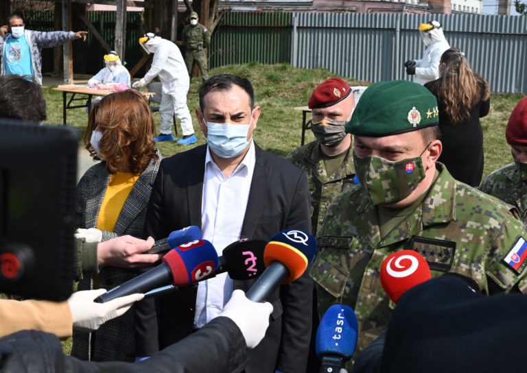 Druhý zľava: Člen permanentného krízového štábu a europoslanec Peter Polák a náčelník Generálneho štábu Ozbrojených síl SR Daniel Zmeko počas brífingu v rómskej osade v Jarovniciach, kde testovali ľudí, ktorí prišli zo zahraničia v rámci mimoriadnej situácie v súvislosti s ochorením COVID-19 spôsobeným koronavírusom (2019-nCoV) na Slovensku. Jarovnice, 3. apríl 2020. Foto: SITA/Viktor Zamborský