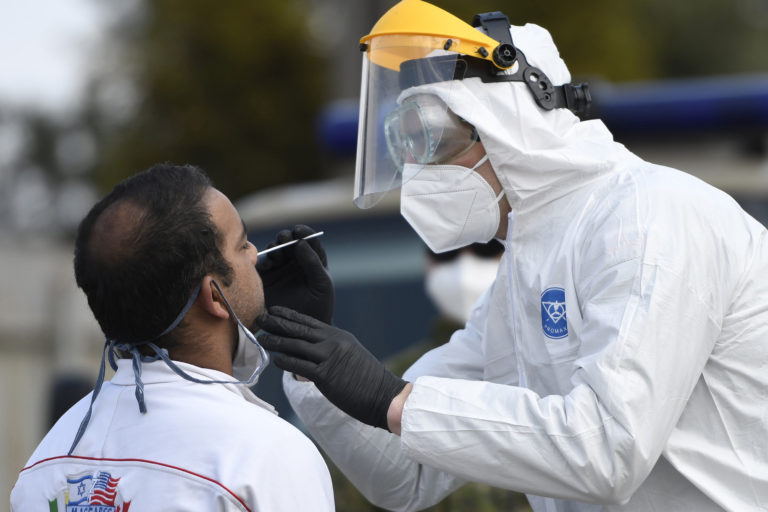 Zdravotník v bielom ochrannom odeve (vpravo) počas testovania ľudí, ktorí prišli zo zahraničia do rómskej osady v Jarovniciach v rámci mimoriadnej situácie v súvislosti s ochorením COVID-19 spôsobeným koronavírusom (2019-nCoV) na Slovensku. Jarovnice, 3. apríl 2020. Foto: SITA/Viktor Zamborský