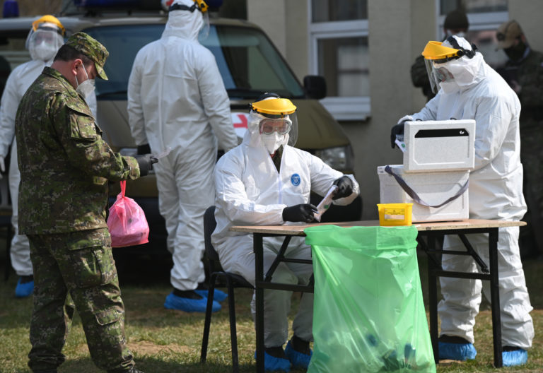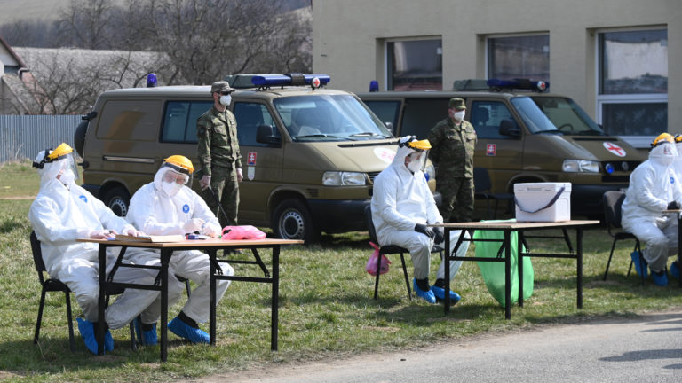 Zdravotníci v bielych ochranných odevoch (v popredí) s pomocou príslušníkov Ozbrojených síl (v pozadí) počas testovania ľudí, ktorí prišli zo zahraničia do rómskej osady v Jarovniciach v rámci mimoriadnej situácie v súvislosti s ochorením COVID-19 spôsobeným koronavírusom (2019-nCoV) na Slovensku. Jarovnice, 3. apríl 2020. Foto: archívne, SITA/Viktor Zamborský