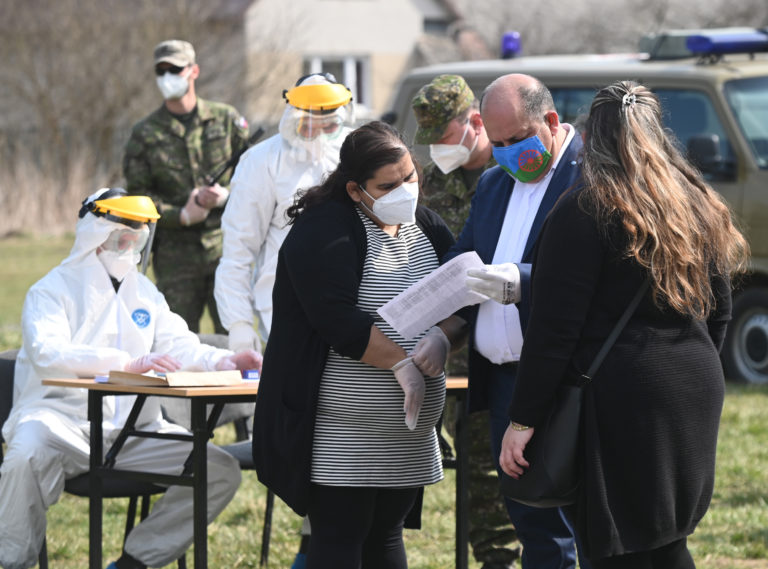 Starosta Jarovníc Florián Giňa (druhý sprava) počas testovania ľudí, ktorí prišli zo zahraničia do rómskej osady v Jarovniciach zdravotníkmi s pomocou ozbrojených síl v rámci mimoriadnej situácie v súvislosti s ochorením COVID-19 spôsobeným koronavírusom (2019-nCoV) na Slovensku. Jarovnice, 3. apríl 2020. Foto: SITA/Viktor Zamborský